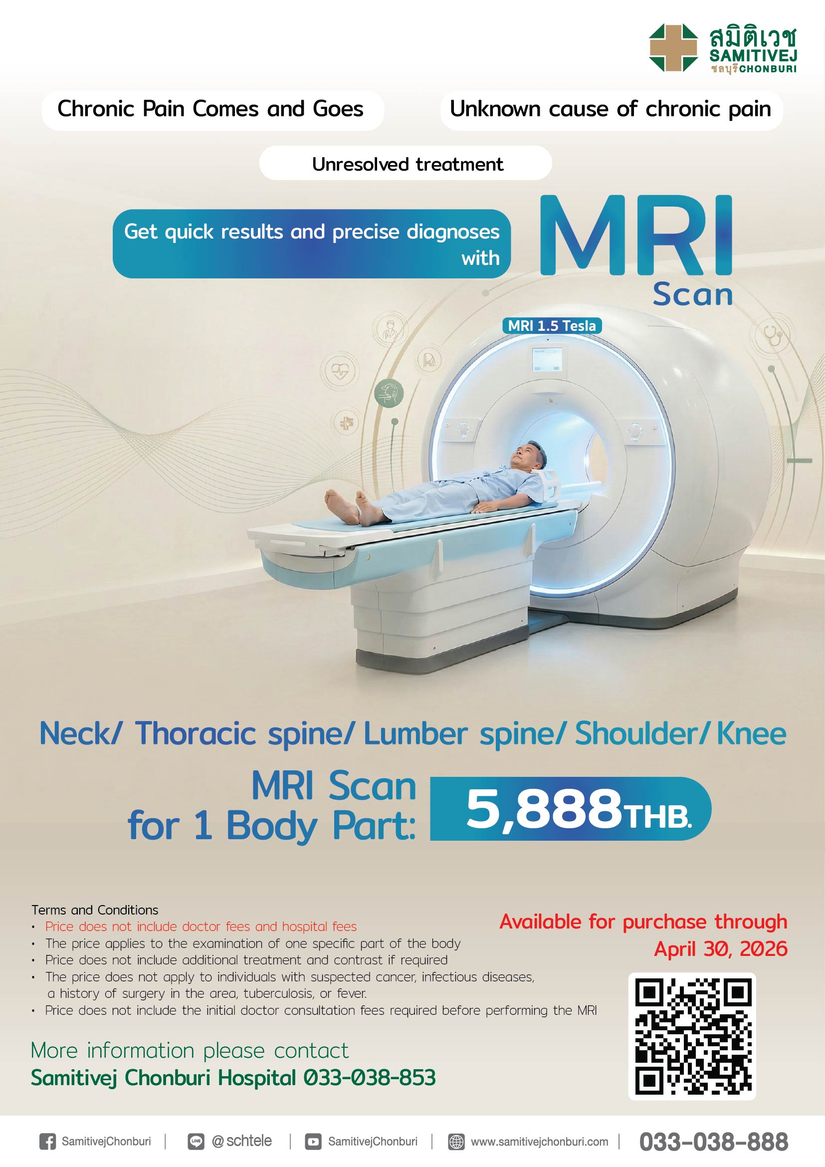 Fast, Simple, and Accurate. Get quick results and precise diagnoses with MRI scan Neck/ Thoracic spine/Lumber spine/Shoulder/Knee MRI Scan for 1 Body Part: 5,888 THB