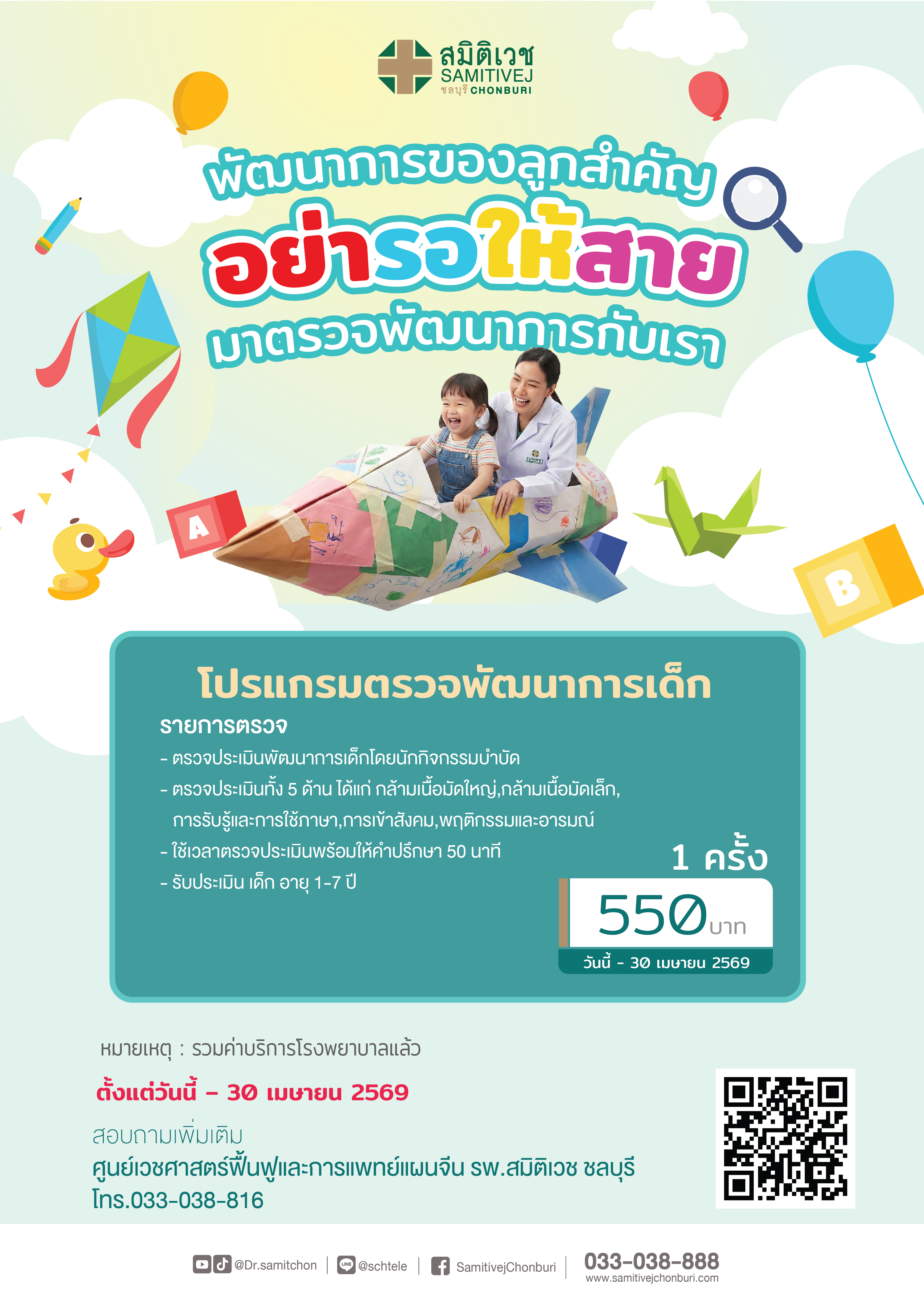 เลี้ยงลูกแบบไหนถึงจะดี ? ลูกจะมีพัฒนาการสมวัยหรือไม่ ? พัฒนาการต้องมากแค่ไหนถึงดีพอ ? คำถามเหล่านี้เป็นสิ่งที่คุณพ่อคุณแม่หลายคนอาจเป็นกังวล แต่เราสามารถเข้าใจตัวตนและค้นหาจุดเด่นของลูกน้อยได้ตั้งแต่ยังเด็ก กับโปรแกรมตรวจพัฒนาการเด็กวัย 1 ปี - 7 ปี ดูแลโดยนักกิจกรรมบำบัด
