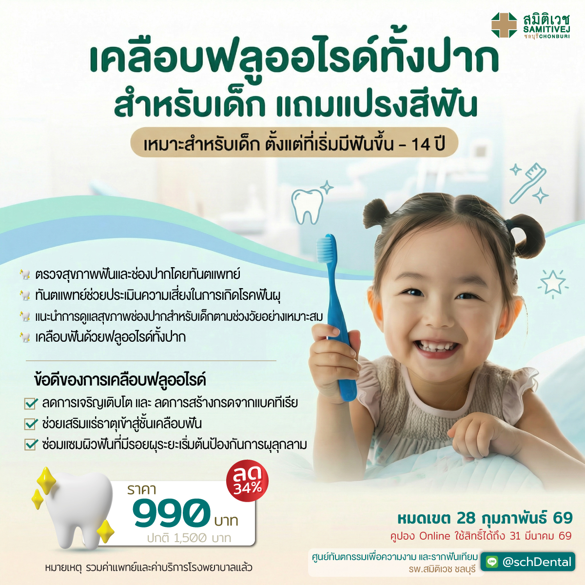 เคลือบฟลูออไรด์ 1 ครั้ง (แถมแปรงฟันเด็ก) ราคา 990 บาท (จากปกติ 1,500 บาท)