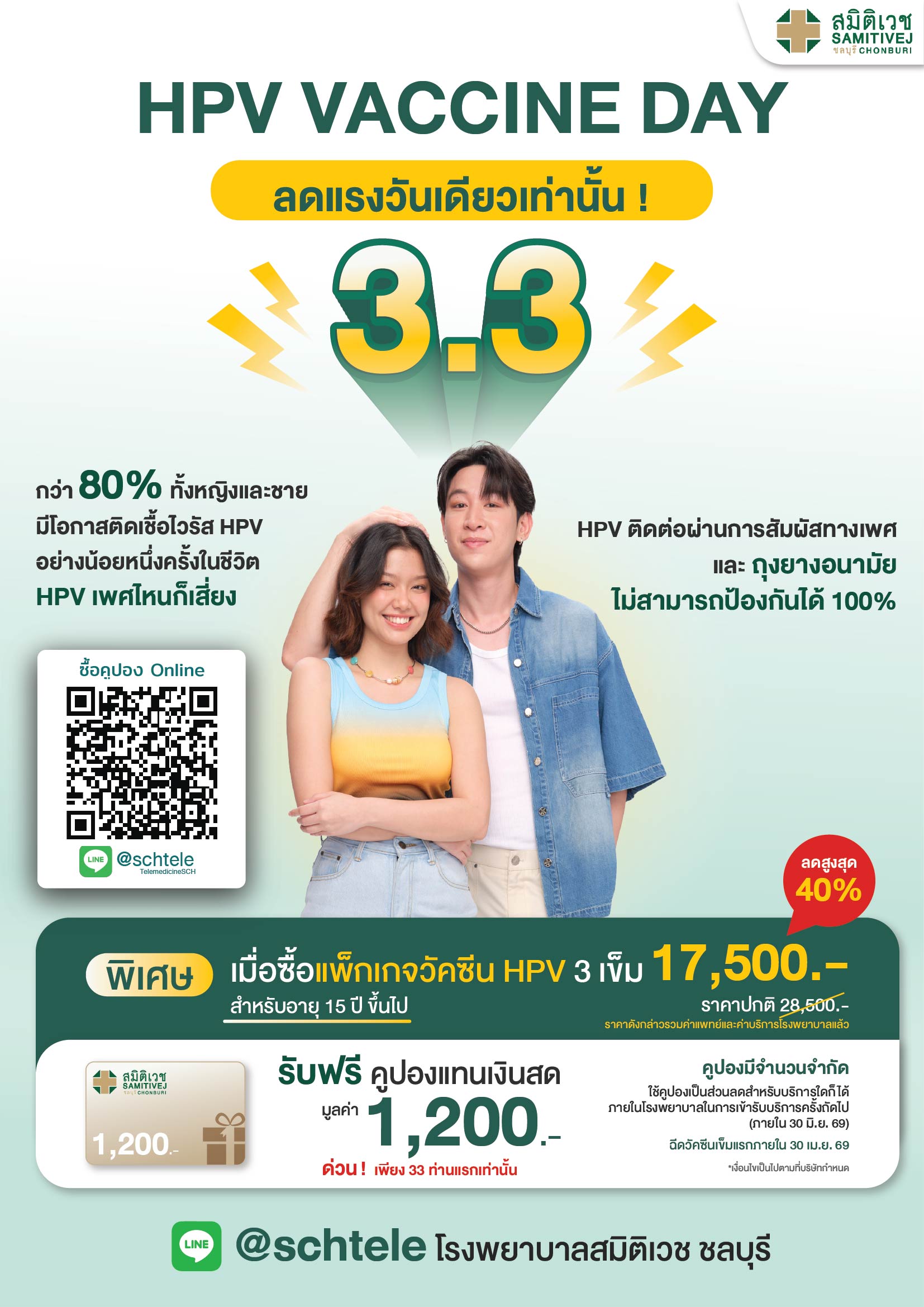 ⚡ 3.3 ลดแรงวันเดียว วัคซีนมะเร็งปากมดลูก 9 สายพันธุ์ 3 เข็ม ราคา 17,500 บาท ขายเฉพาะวันที่ 3 มีนาคม 2569 วันเดียวเท่านั้น! พิเศษสำหรับ 33 ท่านแรก เท่านั้น! รับ คูปองแทนเงินสด 1,200 บาท (สำหรับใช้บริการครั้งถัดไป)